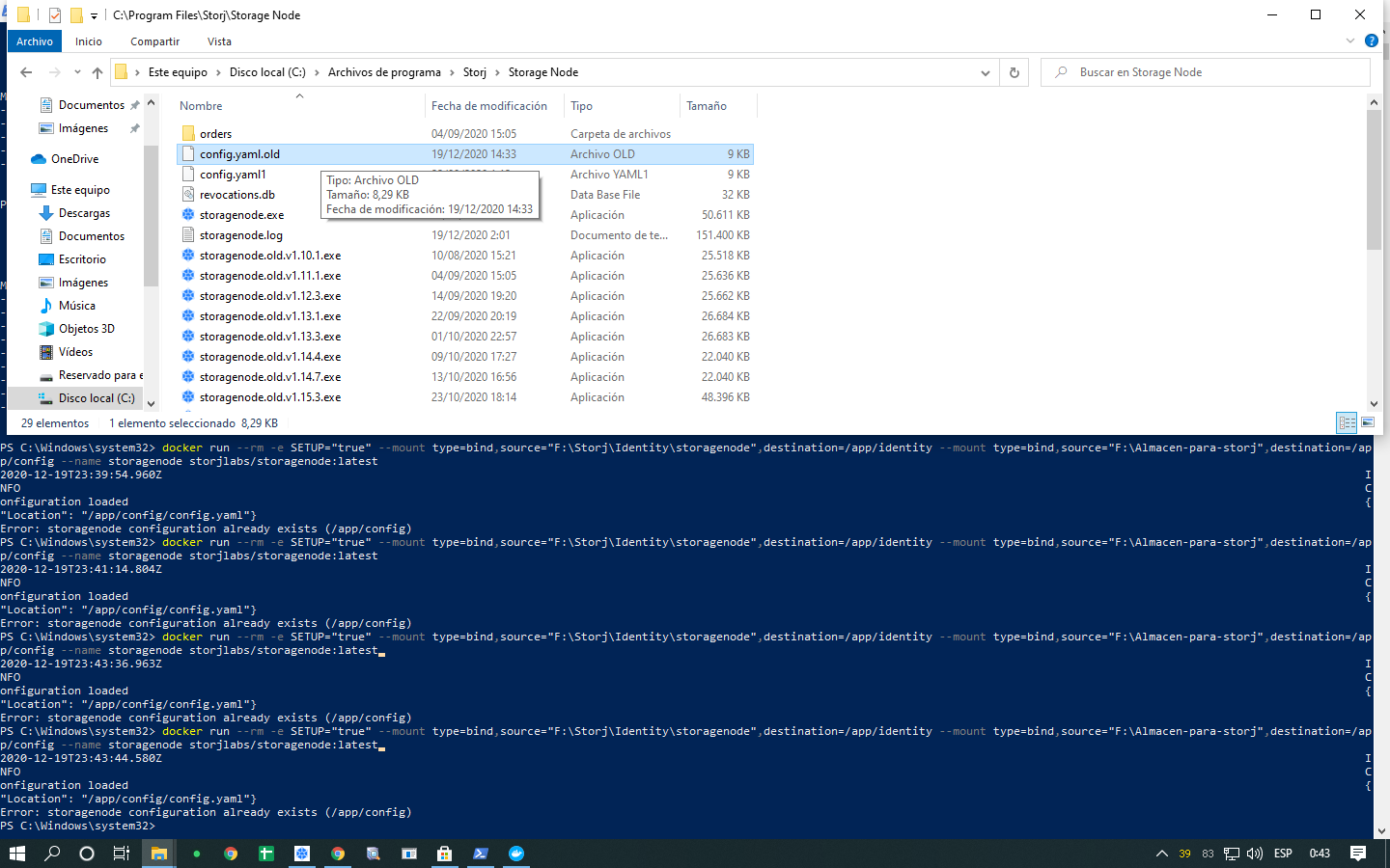 Por favor, cambie el nombre de config.yaml en la F:\Almacen-para-storj