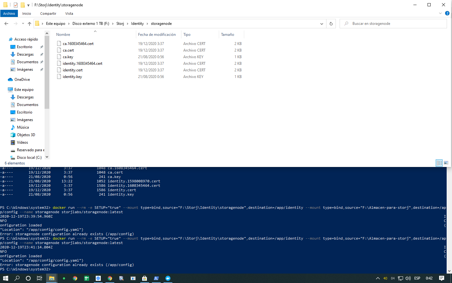 Por favor, copie identity.key y ca.key de la fuente a F:\Storj\Identity\storagenode, ellos también deberían estar allí.