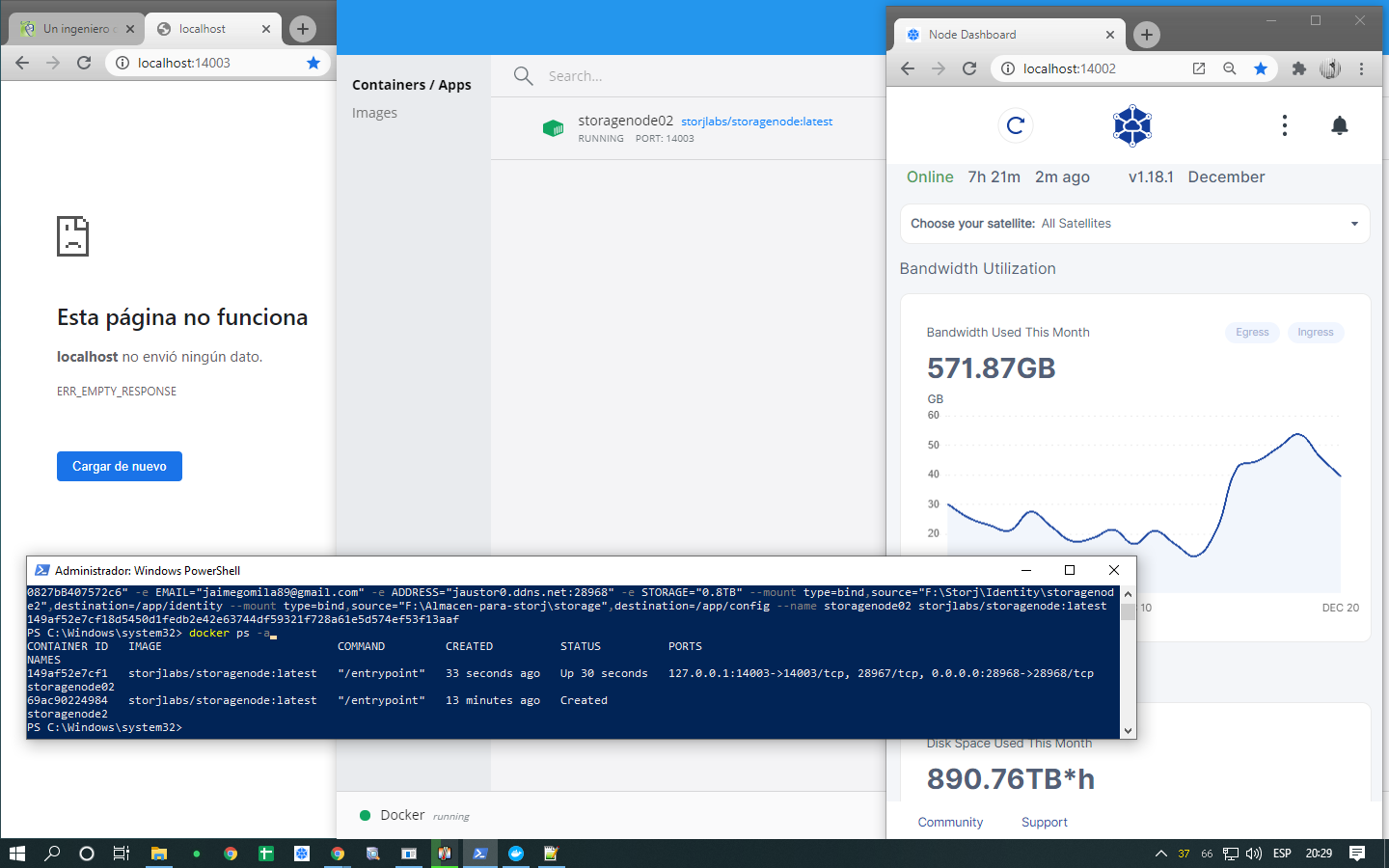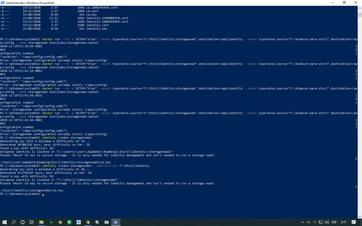 El siguiente paso sería ejecutar su comando docker run con todos sus parámetros, pero la ruta a la identidad será diferente: F:\Storj\Identity\storagenode2 en lugar de F:\Storj\Identity\storagenode.