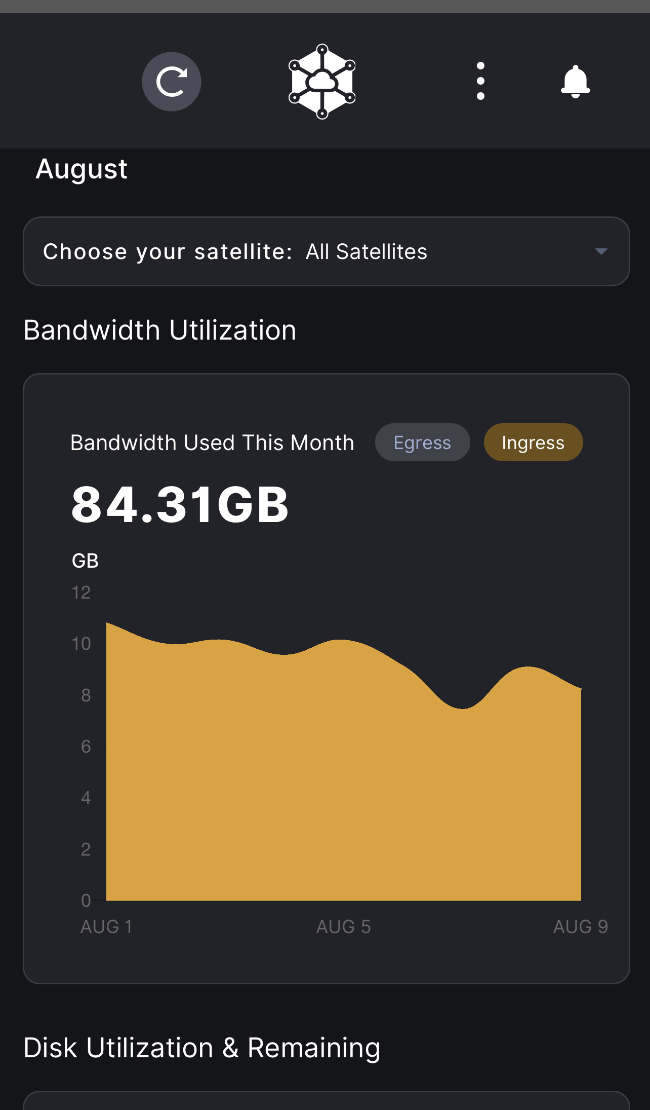 EUNorth1 took me 7 months to be vetted on and as of today I have 34GB Ingress on that satellite. Today my total ingress is 121GB, -34GB for EUNorth1 = 87GB which aligns near your Ingress