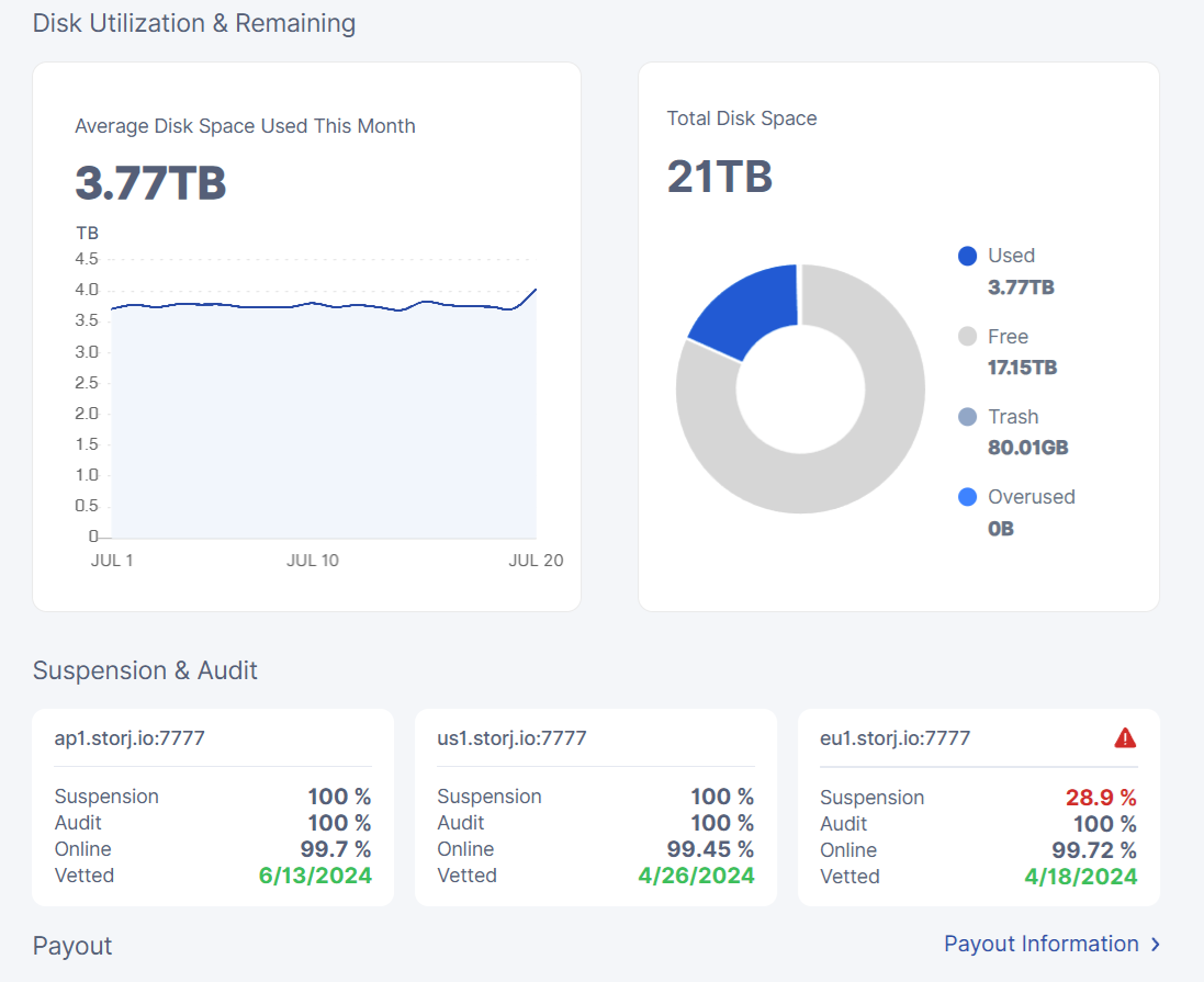 WARN reputation:service node scores worsened {"Process": "storagenode", "Satellite ID": "12L9ZFwhzVpuEKMUNUqkaTLGzwY9G24tbiigLiXpmZWKwmcNDDs", "Total Audits": 141722, "Successful Audits": 140684, "Audit Score": 1, "Online Score": 0.9971701333830808, "Suspension Score": 0.28895593993885077, "Audit Score Delta": 0, "Online Score Delta": -0.00012722646310425745, "Suspension Score Delta": -0.7110440600611492}