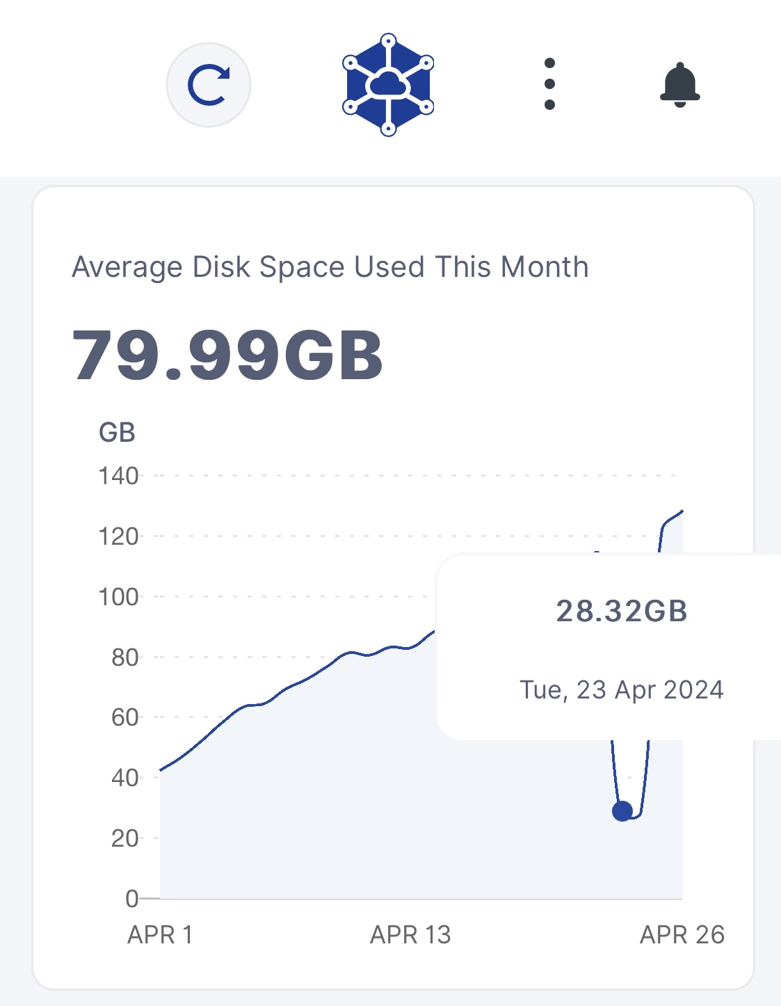 As you can see the node database has a gap between the 22nd and the 24th, but when I calculate the reported disk usage by dividing the reported Bh for the following record on the 24th by the time between those records, the storage usage perfectly lines up with the reports of the other days, so all usage is accounted for. This also confirms that the graph total is effected by the missing days as is should show closer to 0.82TB. Both the graph and query results here show only US1 data.