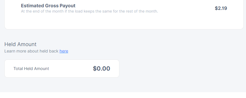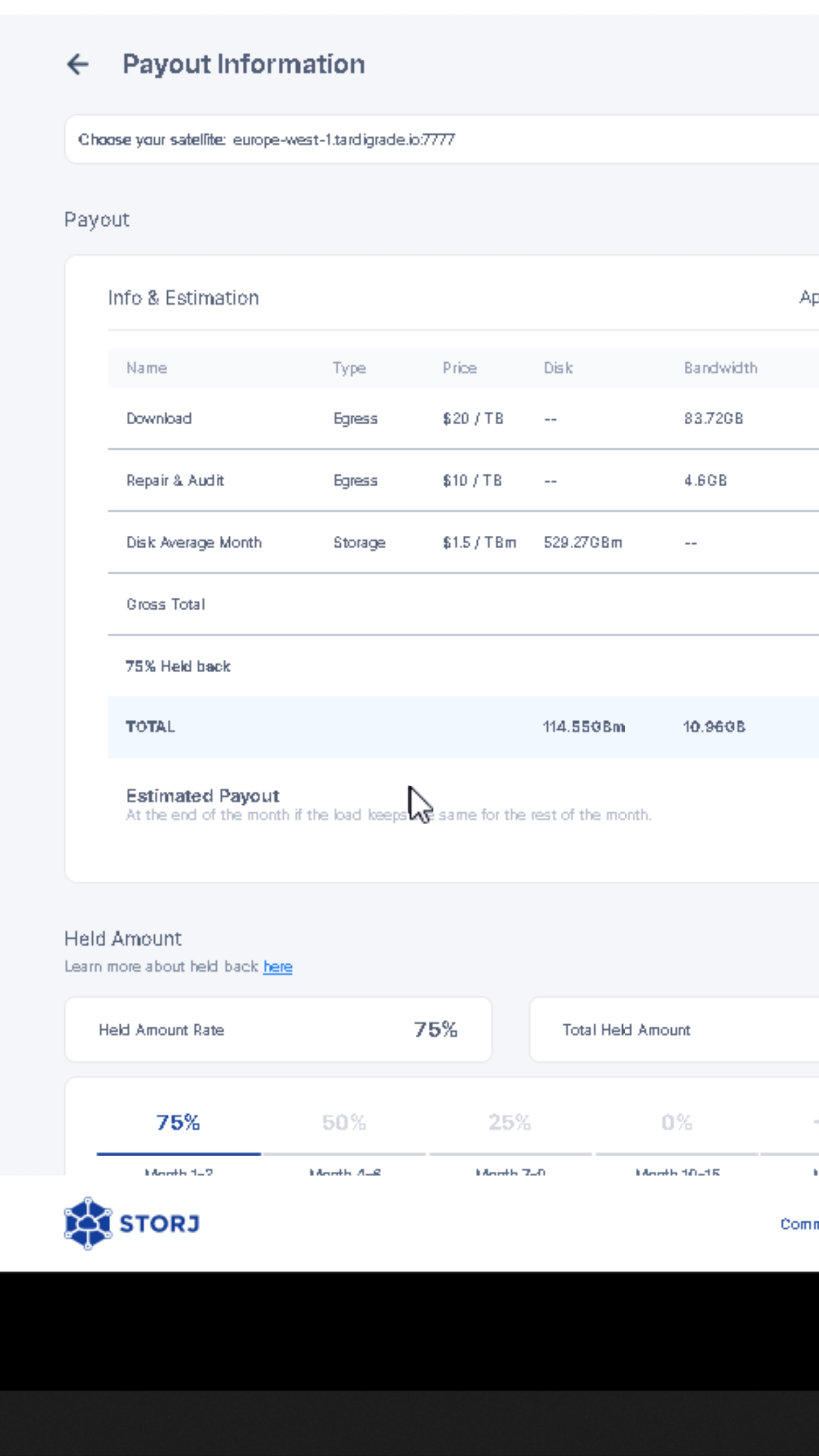 - The payout detail page is calculating the payout for the current month but it is not an estimation what you would get at the end of the month. It is showing you what you would get if your used space and download traffic would drop to 0 for the rest of the month. At the same time, the dashboard is claiming to estimate the payout but that is not the case. We have to change the expectation or we have to match the expectation. I prefer option 2 ofc