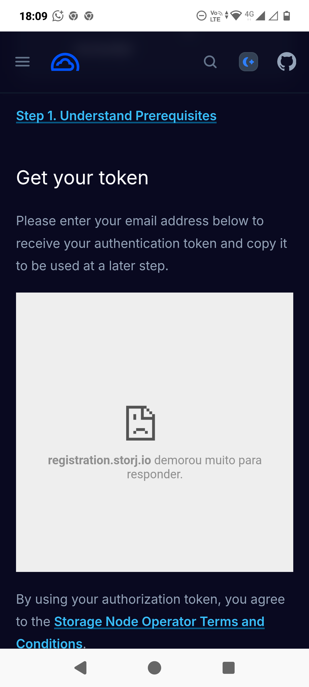 Tentei também acessar o site Storage Node Getting Started - Storj Docs , mas aparece o seguinte erro: