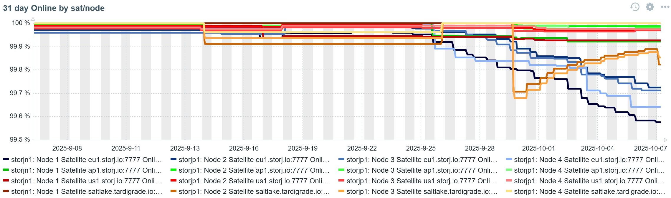 I have several nodes running in different locations, and on each node I’m seeing a constant decline in the online score only for the eu1.storj.io satellite since September 25.