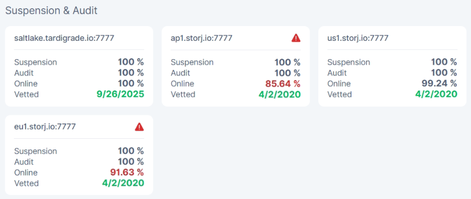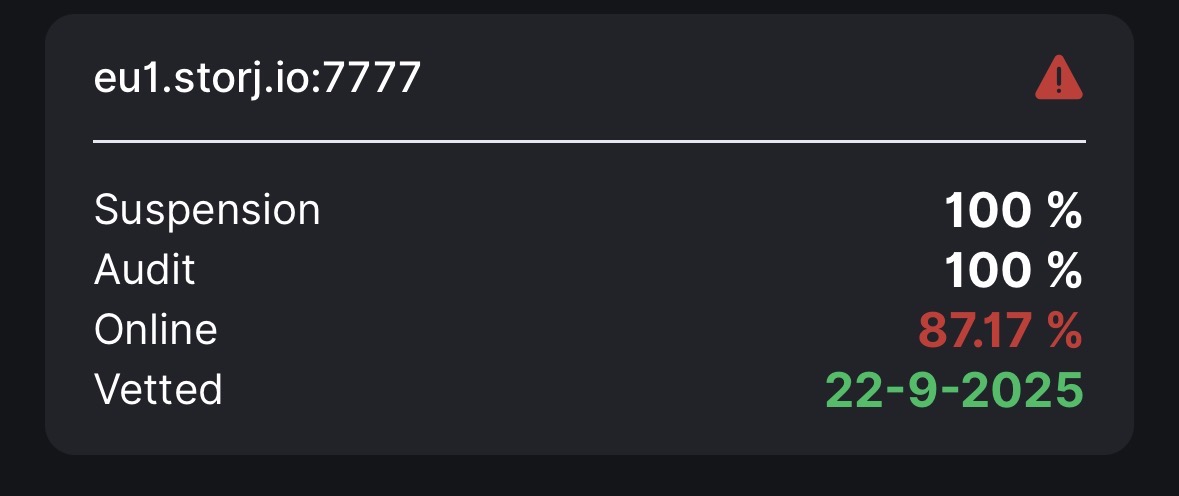 some have EU stats loosing up to 94-90%, and some saltlake too, and US and AP in norm (98%) i will monitor situation, but my blind guess basted on some old observations with uptimerobot is this: online audit gets rejected when traffic hits like last weeks. i will check later and compare. and post results.