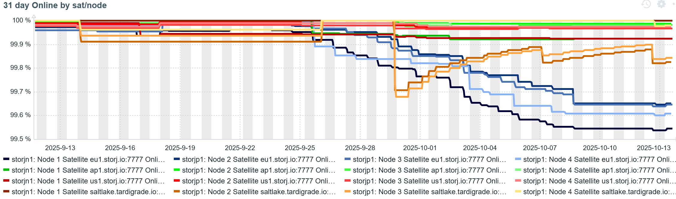 Considering online score is measured as an average over the last 30 days and assuming my online score was 100% for the days 18 days before 26 September and considering my online score now is 99.58%, I deduce that for the last 12 days the average online score would be 99.20% in my case. If things continue as they are now, I will probably see my online score converge to this value. Not a big problem, but strange this affects EU1 only nonetheless.