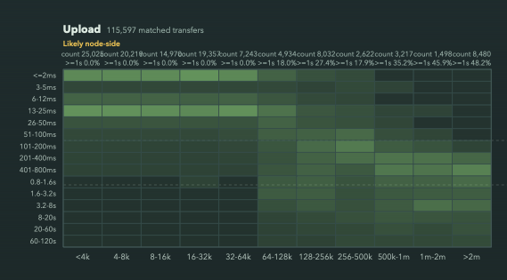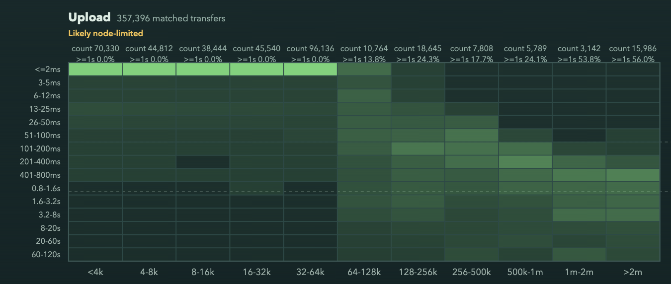It bothered me that I don’t understand the sharp behaviour change at 64k for uploads, (and minimum floor of 100ms for downloads, not shown here, which I understand the reason for)