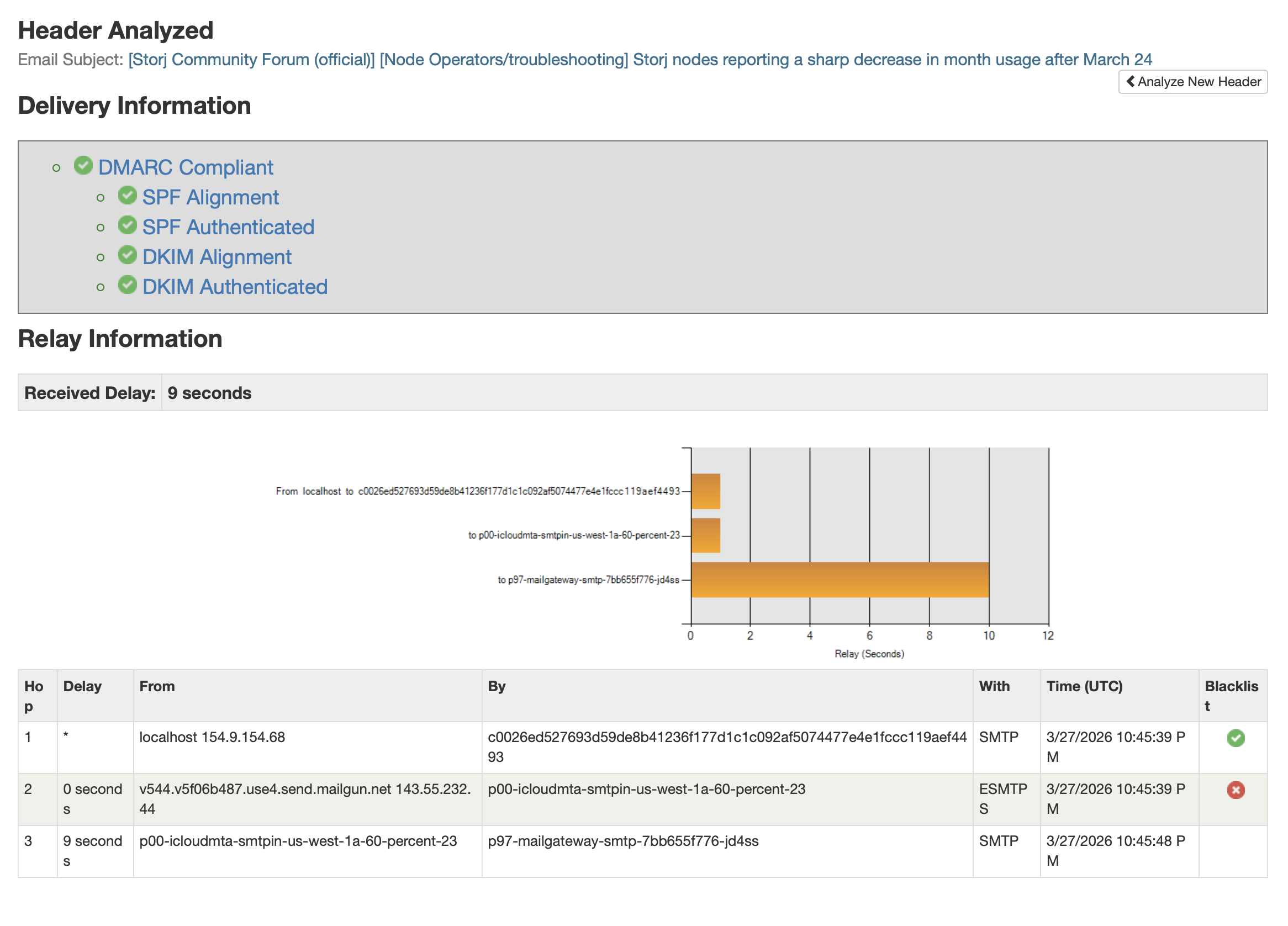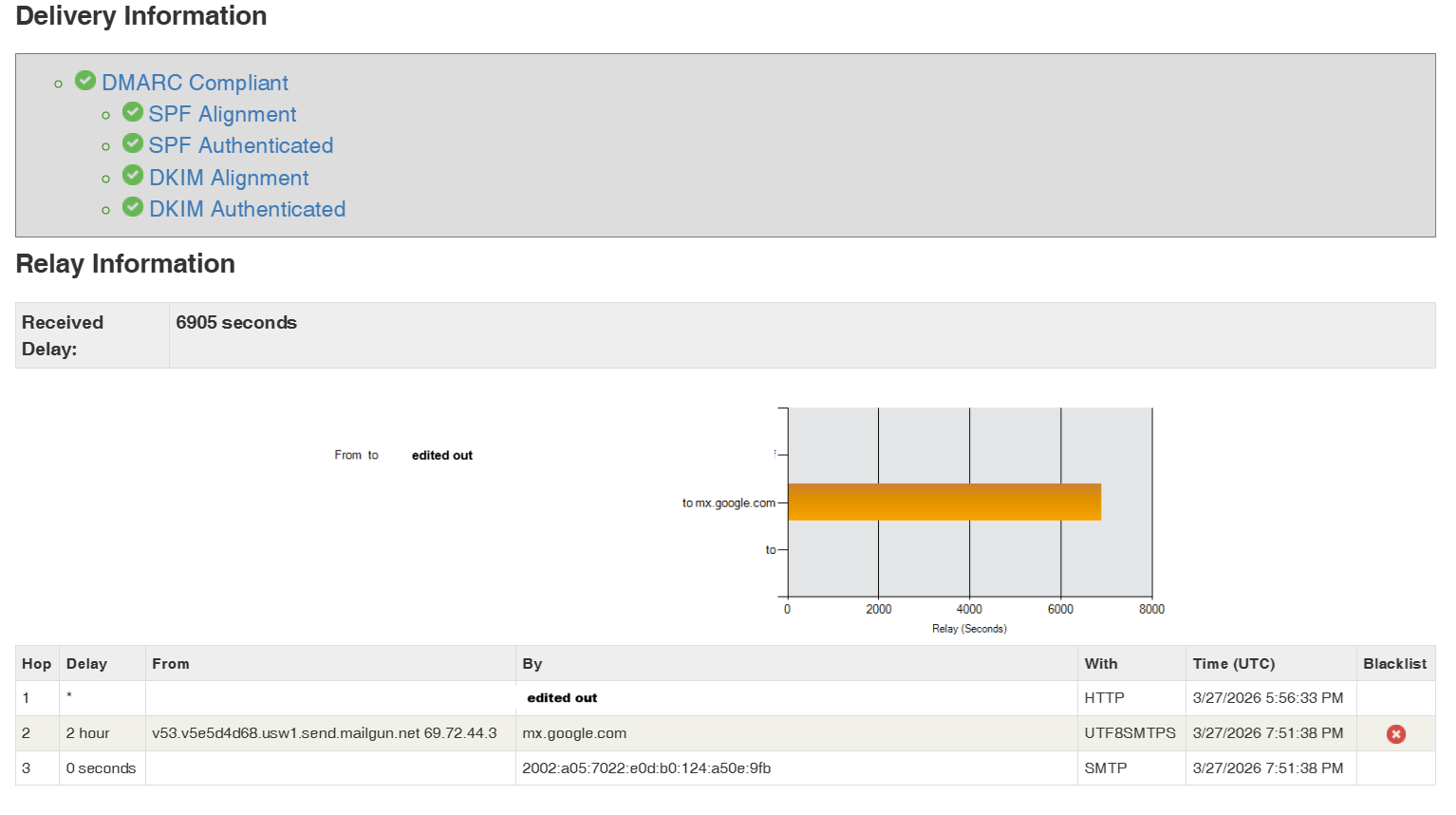 So, I see a blacklist mark on the same field on both headers and a verry big delay from the sender to receiver, if I interpret this correctly.