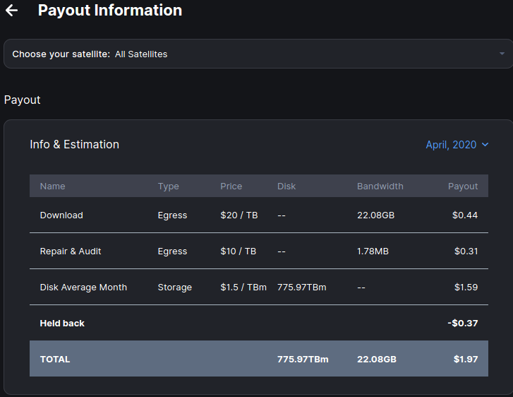 My node has just passed the 2 month mark yesterday, and thus far i’ve gotten 30-40 storj tokens paid and my dashboard claims i got 19$ withheld.