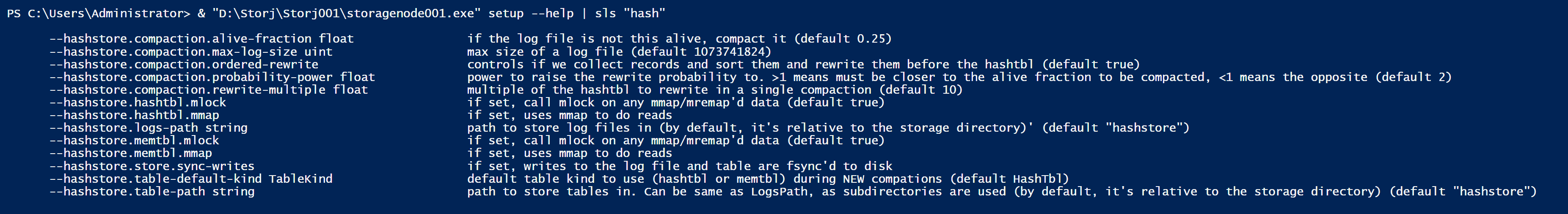 & "C:\Program Files\Storj\Storage Node\storagenode.exe" setup --help | sls "hash"