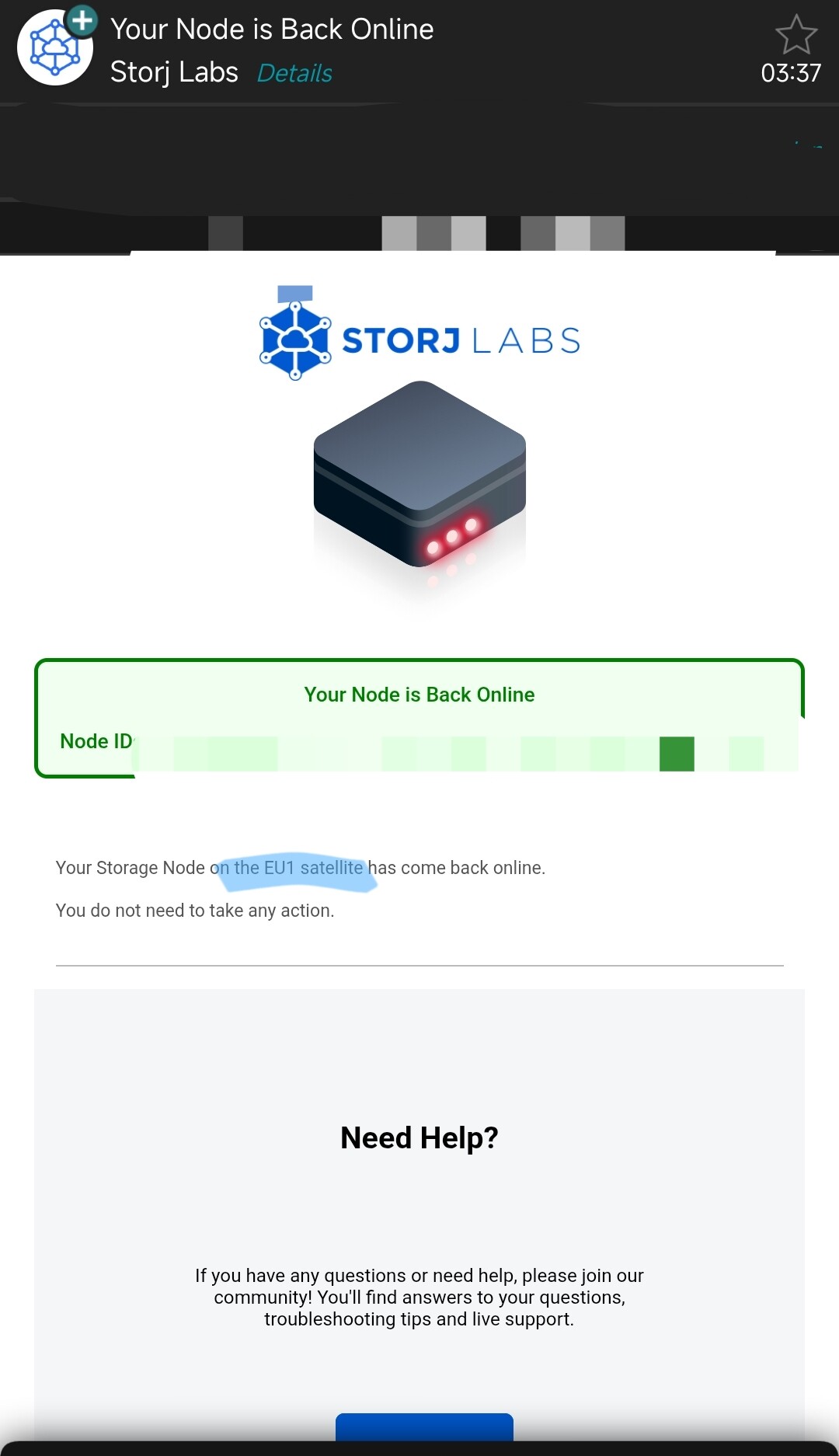 But after a while, I receive an email saying that my node is back online on the satellite… Hmm?