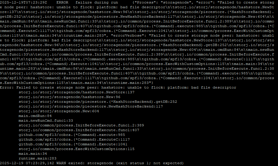 starting with version 1.120.4, storj would fail and throw an error “Failed to create storage node peer: hashstore: unable to flock: hashstore: bad file descriptor”
