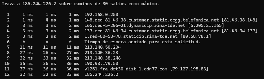 I would like to bring to your attention RIPE Atlas measurements that perform ping or traceroute from various networks around the world, including Spain. There is around 250 probes in Spain. From what I can see at https://atlas.ripe.net/measurements/127246035 as of 2025-09-05 19:50:45 local, 127 probes reached 185.244.226.2, 102 probes did not.