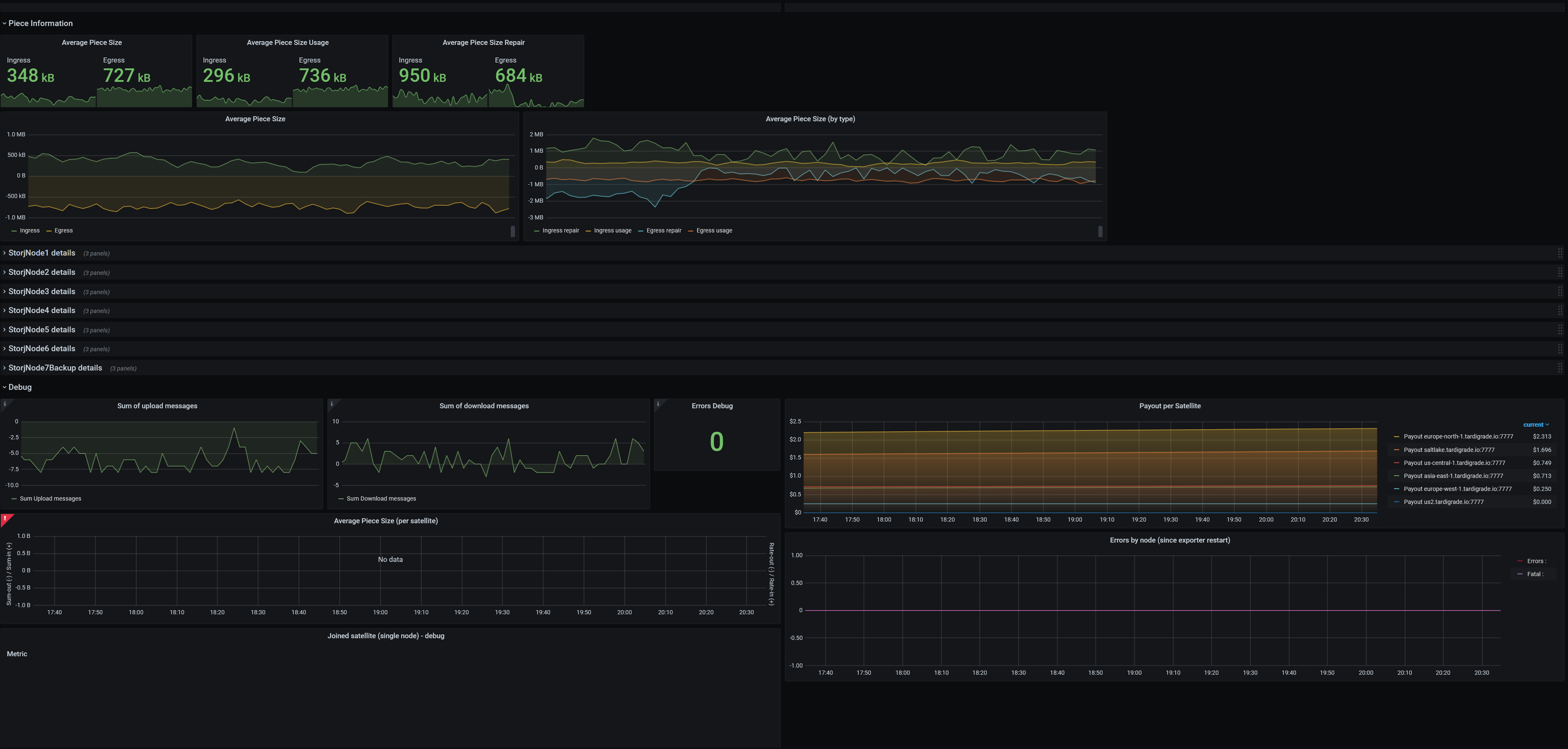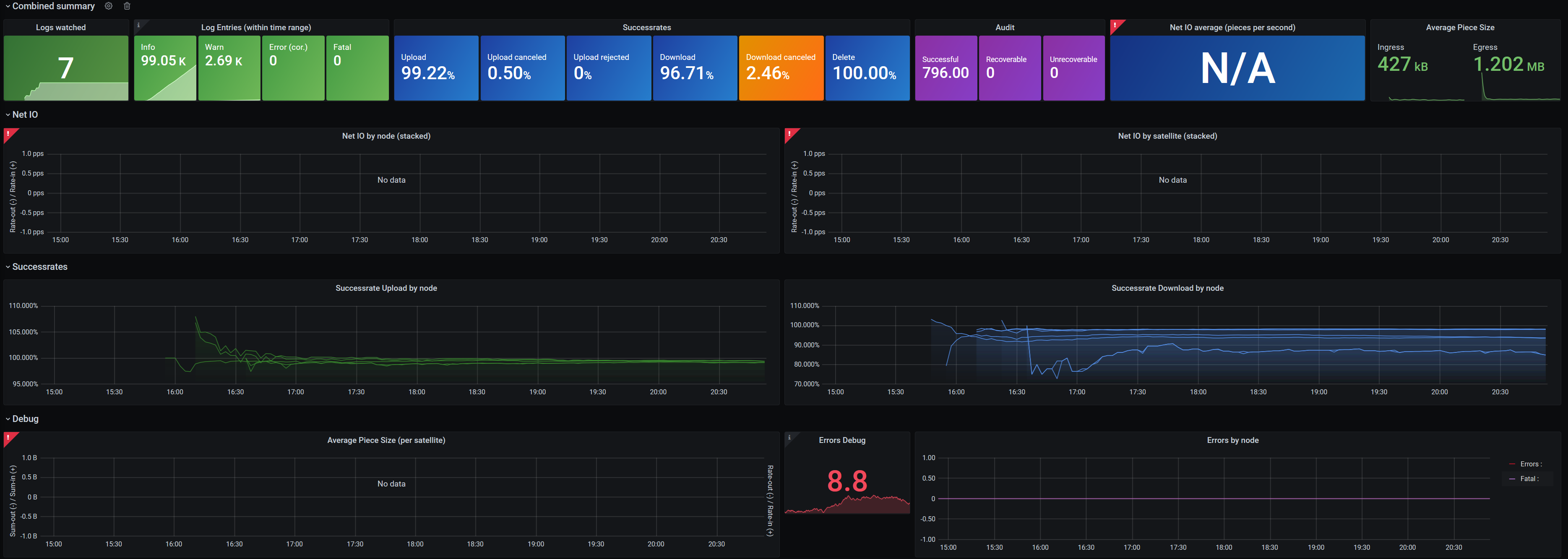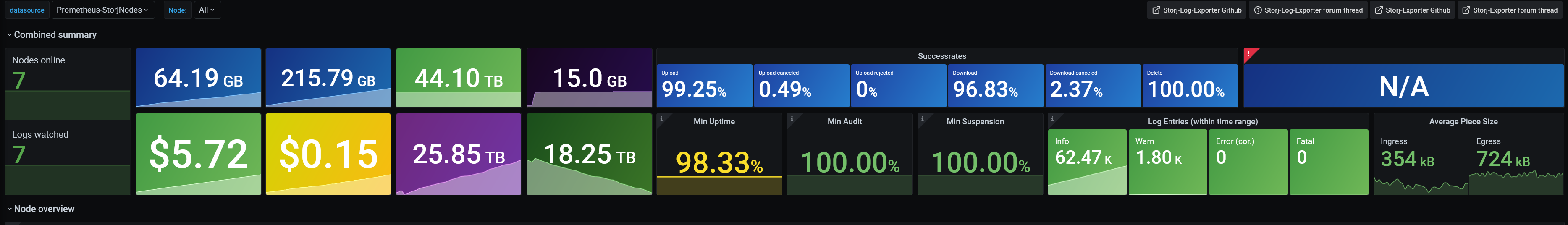 - Combined Summary with all important information. If you only look at these, you wonāt miss anything important. It will warn you about (among other things) new error messages or the minimum uptime/audit/suspension score of any node on any satellite, so you can quickly see if one node is having a problem.