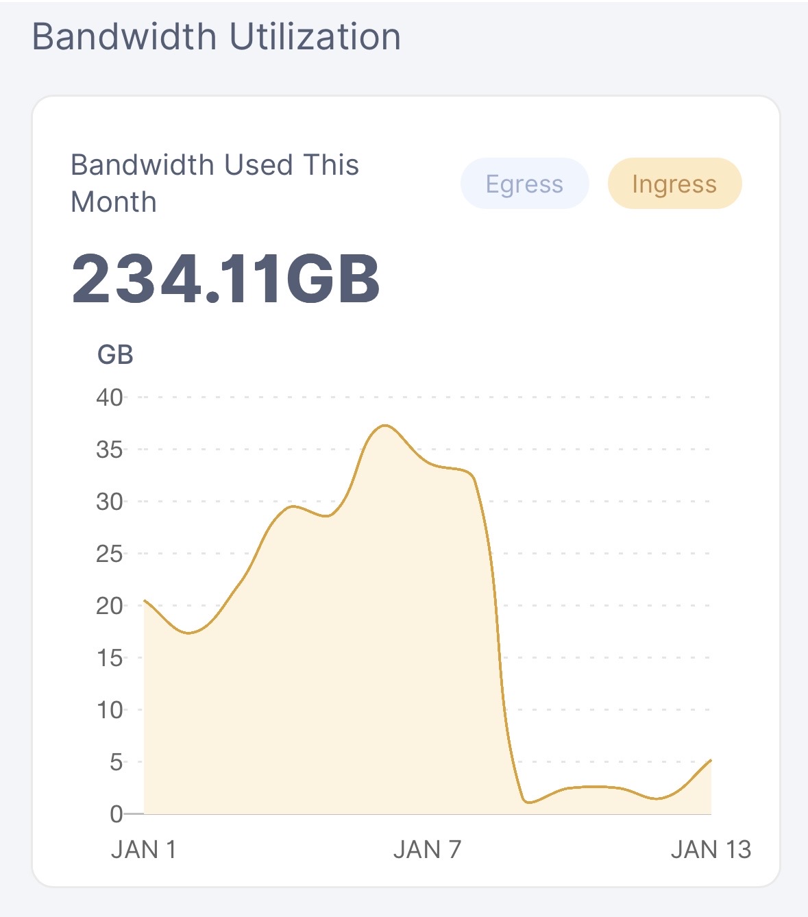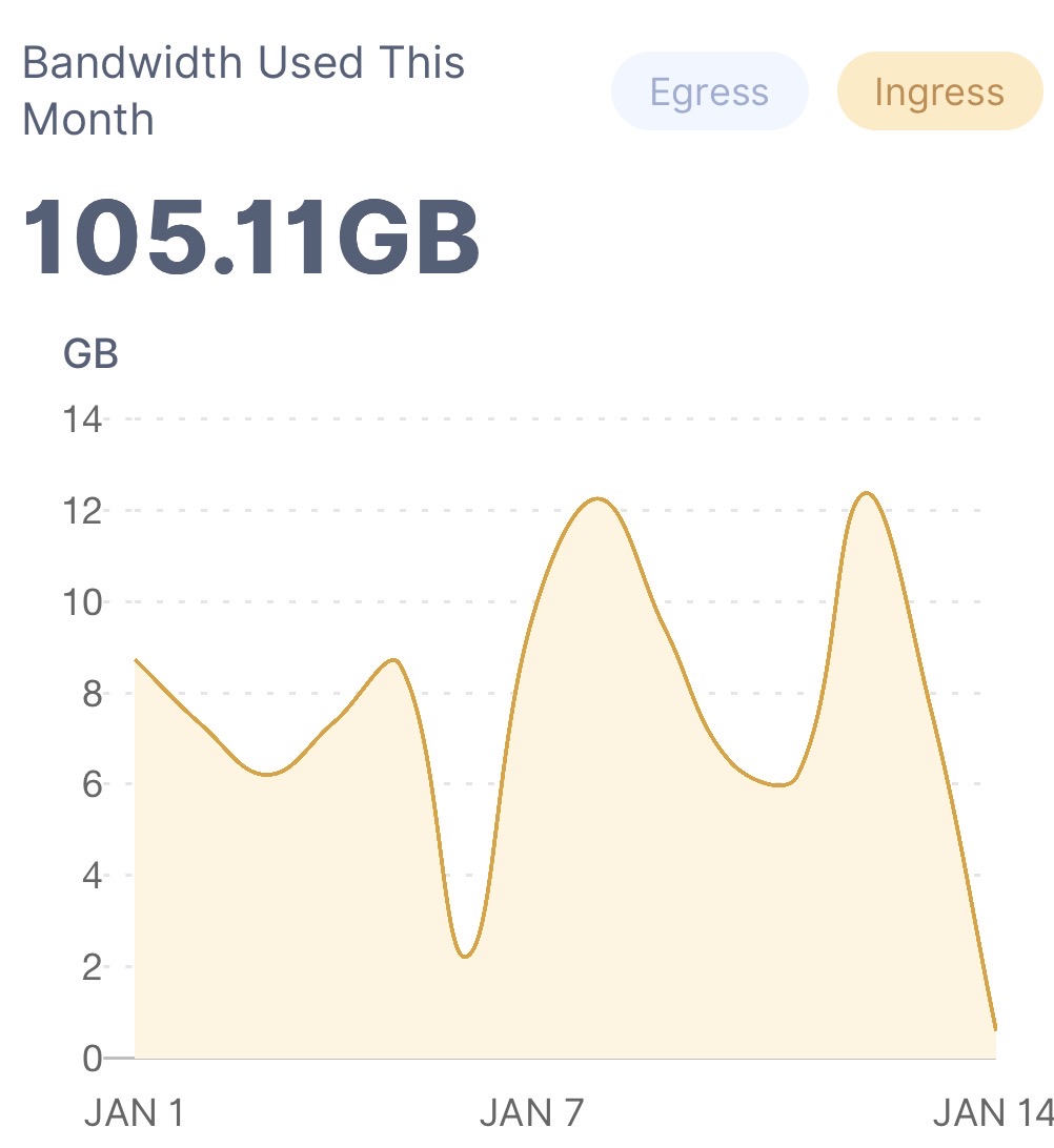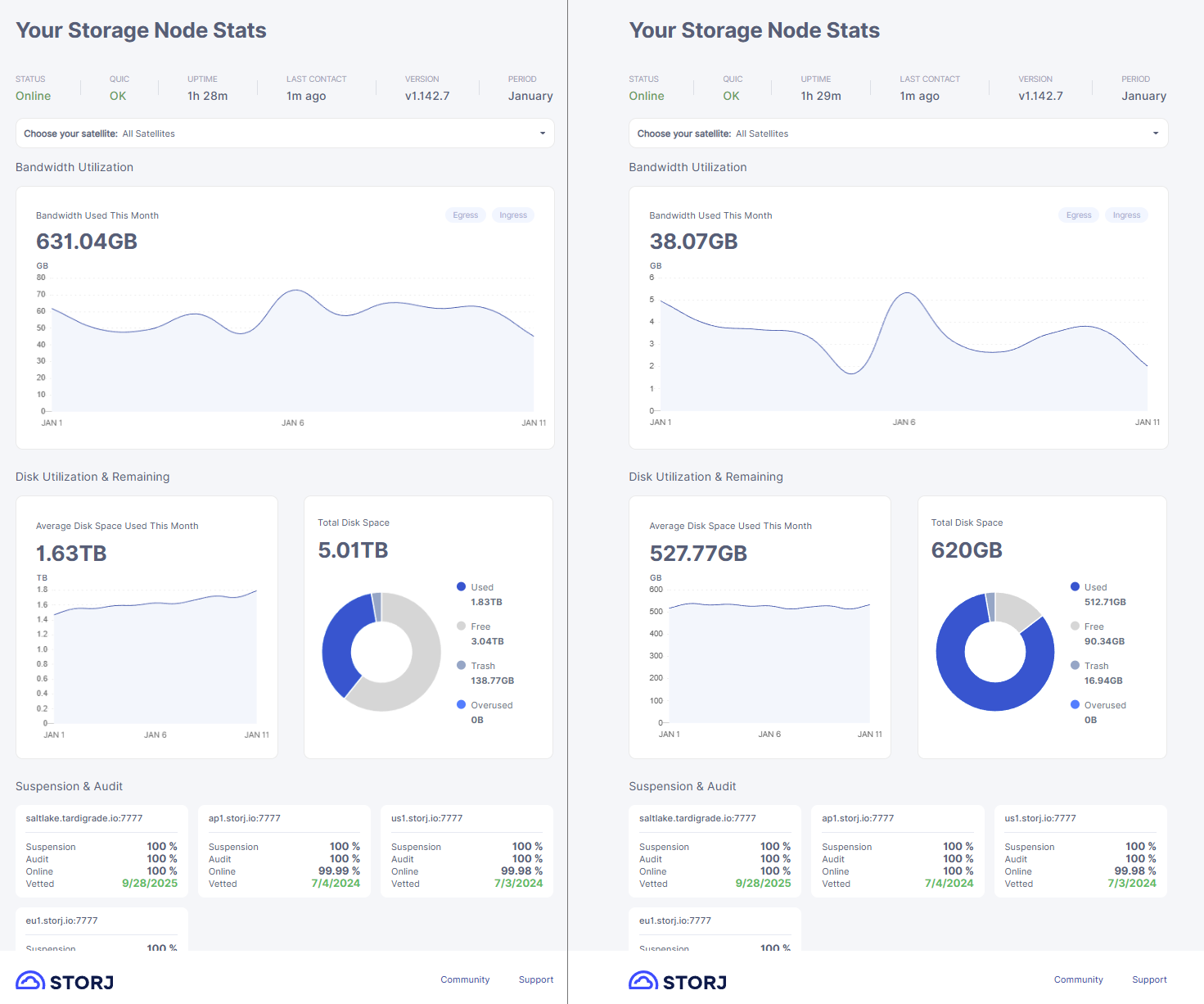 Here’s an image of two nodes on the same subnet. There are 25 nodes on the same subnet. 24 of them are showing the same behavior; nodes are sized from 500-650GB, and have all completely stalled in growing in size. The 25th node is sized at 5TB, and gets healthy ingress every day.