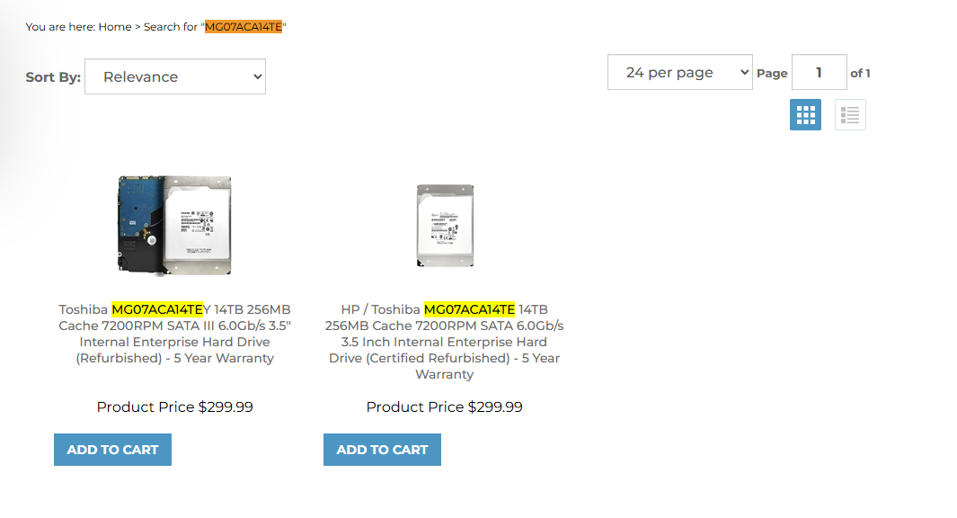 | Used enterprise HDD | GHD Toshiba MG07ACA14TE cert refurb | 14 | 249.99 | 7.0 | goHardDrive | 17.856428571428573 |