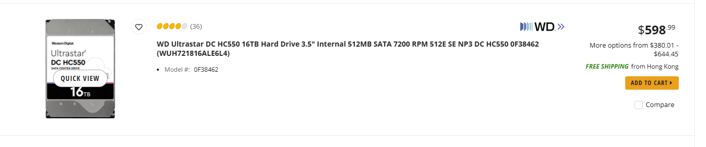 | New enterprise HDD | WD Ultrastar HC550 WUH721816ALE6L4 | 16 | 494.45 | 8.8 | Newegg | 30.903125 |