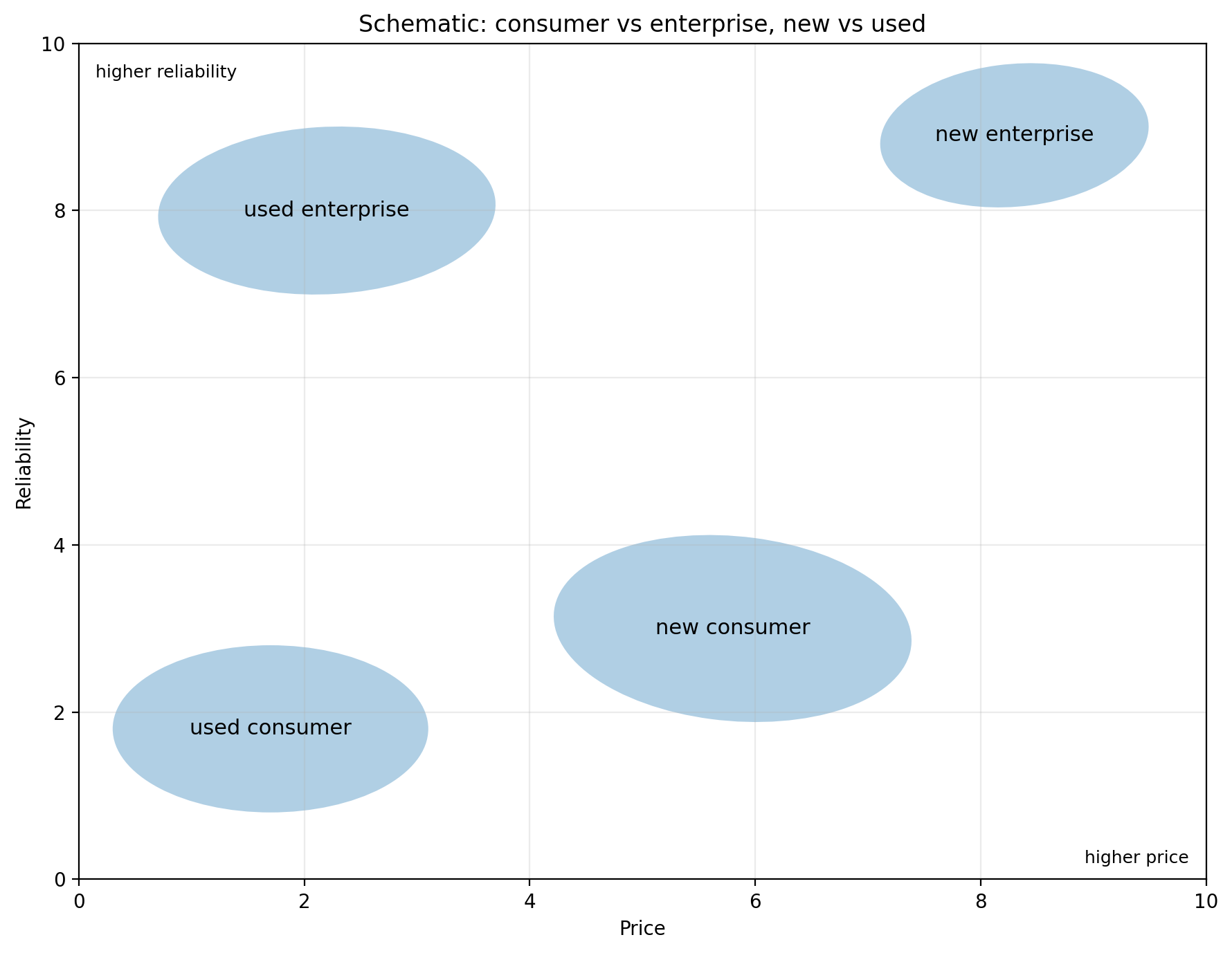 The plot uses current March 2026 market listings for 8 TB and larger hard drives, split into four classes: new consumer, used consumer, new enterprise, and used enterprise. The x-axis is normalized price in USD per TB, computed from listing price divided by capacity, so capacity differences do not dominate the chart. The y-axis is a reliability proxy, not measured field failure rate: drives are placed by product family using OEM reliability-adjacent specifications such as workload rating, warranty length, MTBF or AFR, and published positioning of desktop, NAS, and datacenter lines, with an explicit penalty applied to used, refurbished, recertified, and open-box listings because prior service history is unknown. Each sampled listing is plotted as a point, and the shaded regions are kernel-smoothed density fields derived from those point coordinates to show where each market segment clusters in price-versus-reliability space.