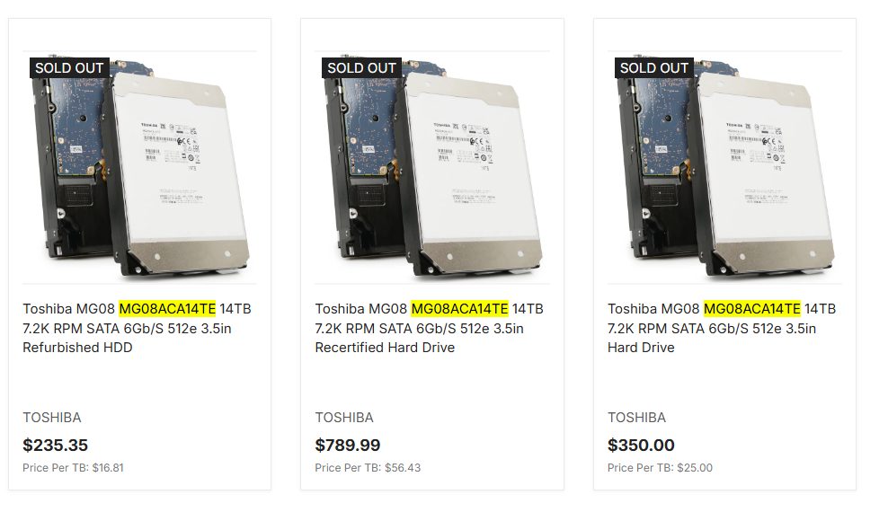| Used enterprise HDD | SPD Toshiba MG08ACA14TE refurb | 14 | 159.99 | 7.1 | ServerPartDeals | 11.427857142857144 |