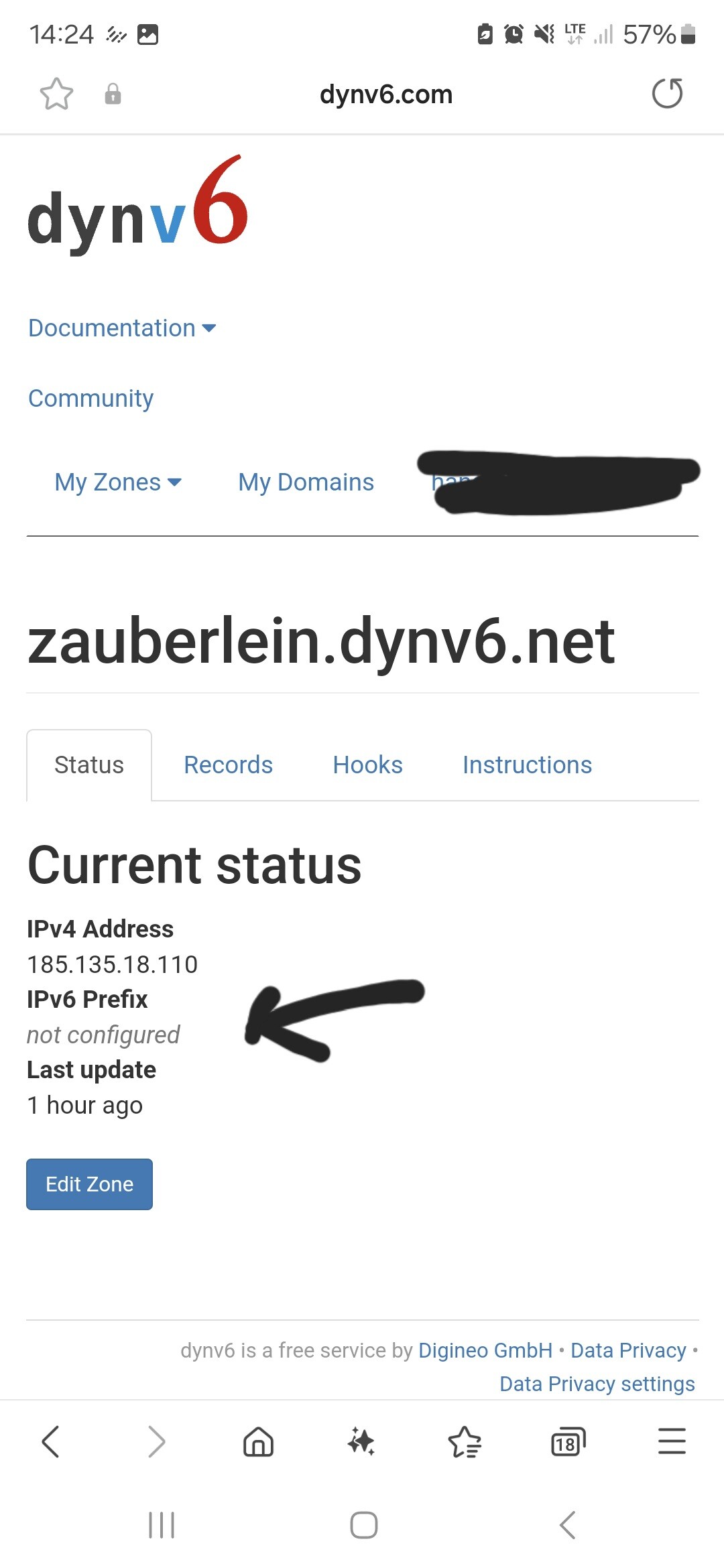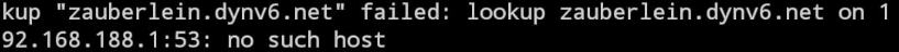 dein dns (192.168.188.1 vermutlich dein router) versucht zauberlein.dynv6.net aufzulösen und dabei kommt nichts raus weil es die adresse nicht gibt, auch die domain dynv6.net gibt es gar nicht, haste dich verschrieben?