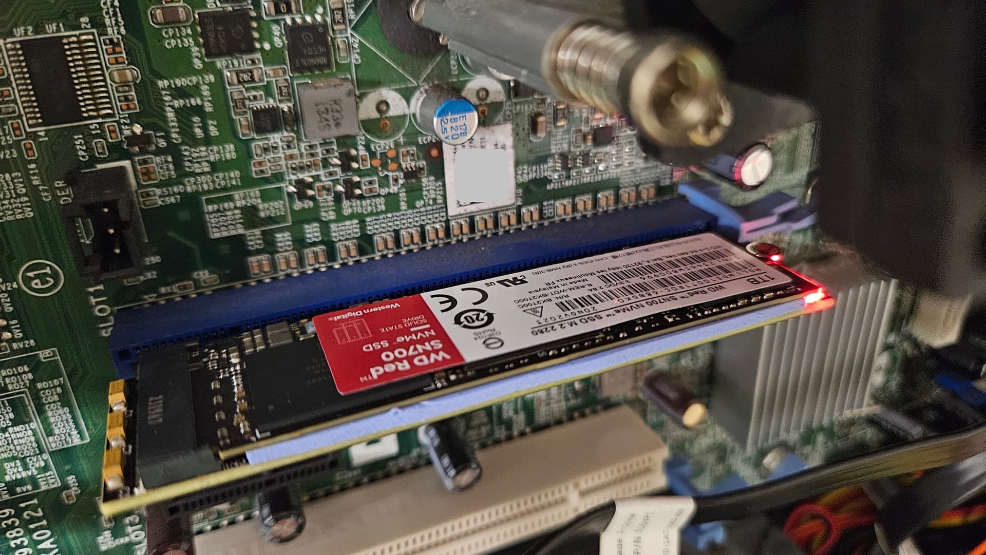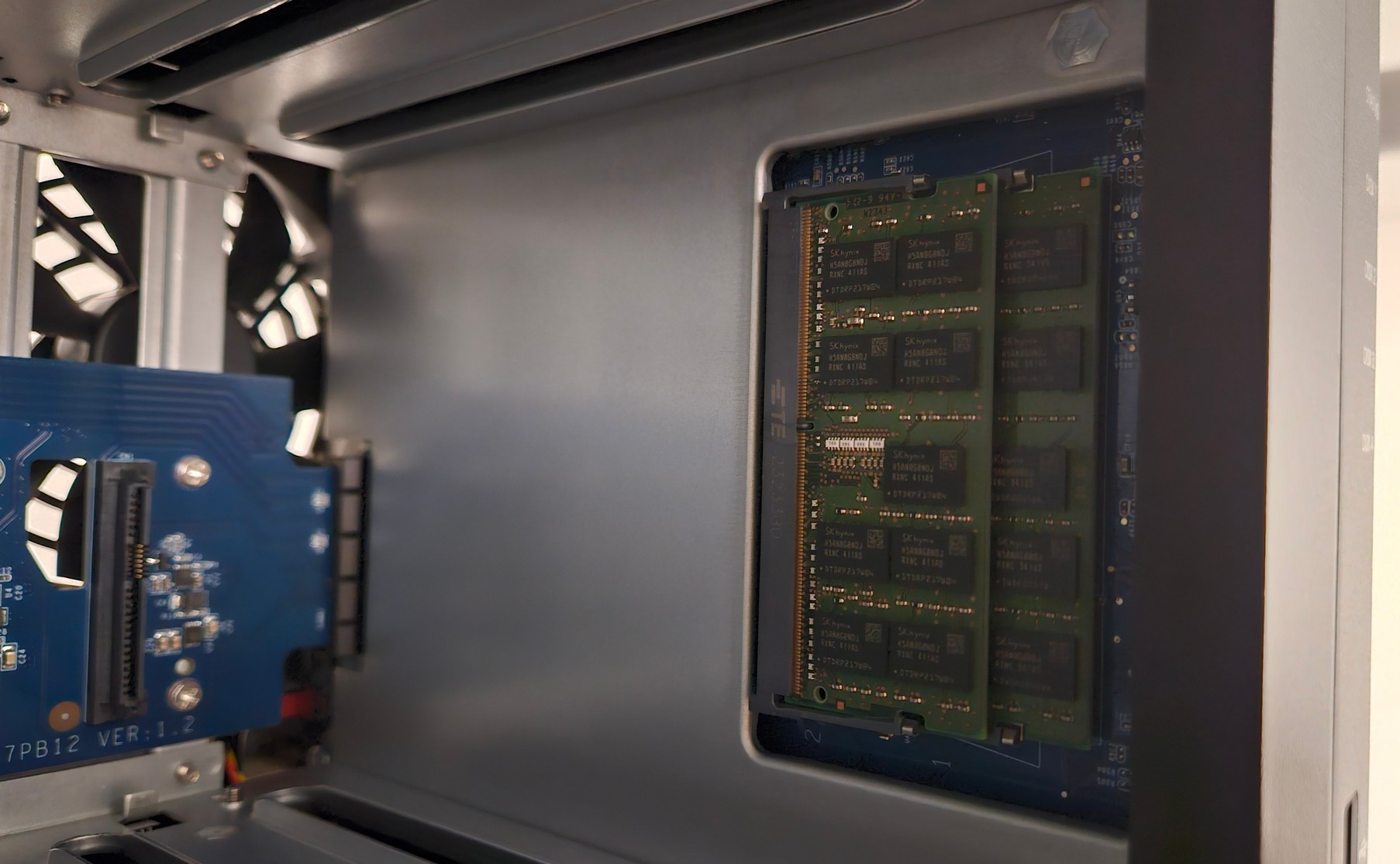 Interestingly, the board has silkscreening for two additional RAM slots, which is probably used in a similar xs model somewhere. I also really enjoy the use of the two sideways PCIe 1x connectors, that connect to the drive backplane