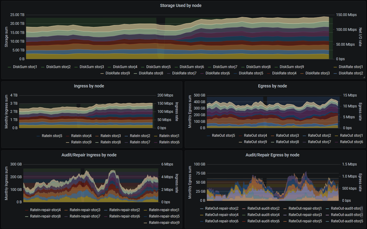 @greener, I’ve made a slight modification to the Boom Table dashboard and issued a pull request for your consideration. For the disk space used panel on the per-node details, it seems as though the storj_diskSpace_used{instance=~"$node.*"} target no longer has data, so I’ve modified that to storj_total_diskspace{,type="used",instance=~"$node.*"} instead.