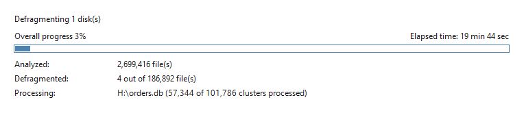 I’ve also stopped the node right now and started defragmentation. The orders.db file has over 13k fragments scatted on the whole disk - it’s madness. And 2 MB files have over 500 fragments. No wonder it’s working slow.