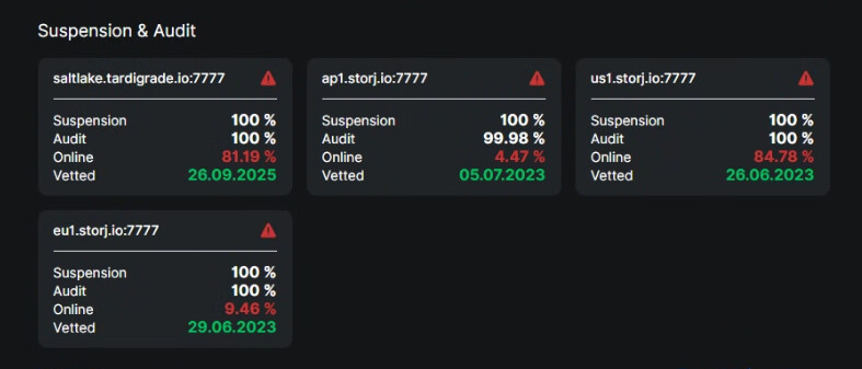 I have several nodes running in different locations, and on each node I’m seeing a constant decline in the online score only for the eu1.storj.io satellite since September 25.