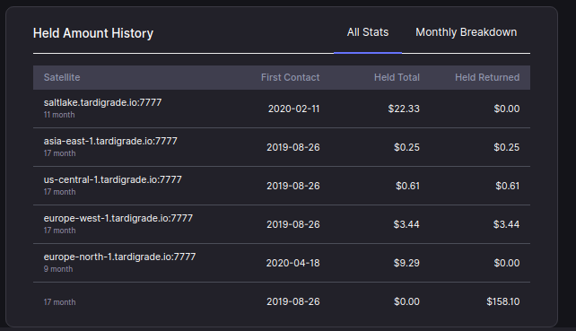 yeah it seems very wrong that a satellite can just vanish from the dashboard… giving us not much idea of what it took with it… this kind of information should be stored locally and not be changed after it is initially concluded to preserve an unaltered log of payouts, earnings, held amounts and such…
