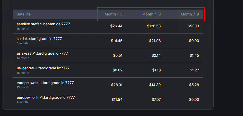 My only other issue with the new payouts dashboard is that the held amount history isnât super useful at the moment. Currently it is unclear if the amounts in the 1-3, 4-6, 7-9 columns are for that specific month range, or if it is the cumulative amount held. I suspect itâs the amount for the range based on what I am seeing from my node, but this could be more clearly communicated. Seeing the current total held amount for each satellite as well as whether the 50% holdback has been returned would be more immediately useful than the history I think.