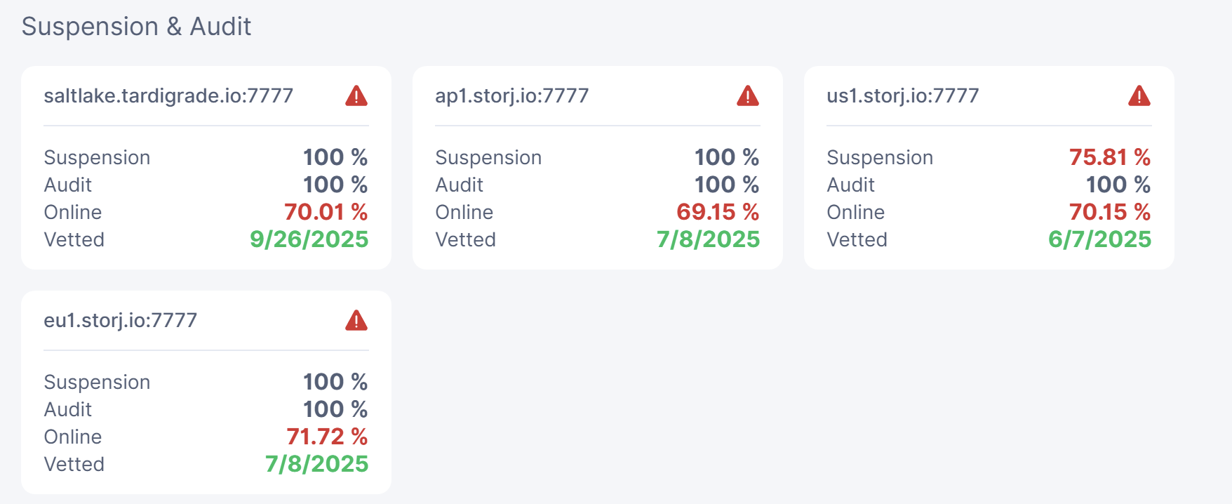 │ us1.storj.io:7777 (WARN: Audits failing) │ │ $ 1.49/TBm $ 2.00/TB $ 2.00/TB 0% 100% │