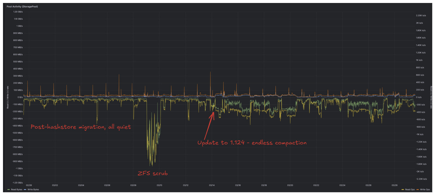 Just today, about 100GB of trash got deleted and that triggered about 1.5h compaction burst. No small time, that, but nothing like the “catch-up” disk thrashing.
