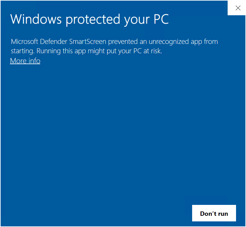 Right upon starting the installer I get this message, not sure how you as a program author can avoid it, but I’m not seeing this when installing any other software (Obviously I do click More info > Run anyway, but it does not look that trustworthy)